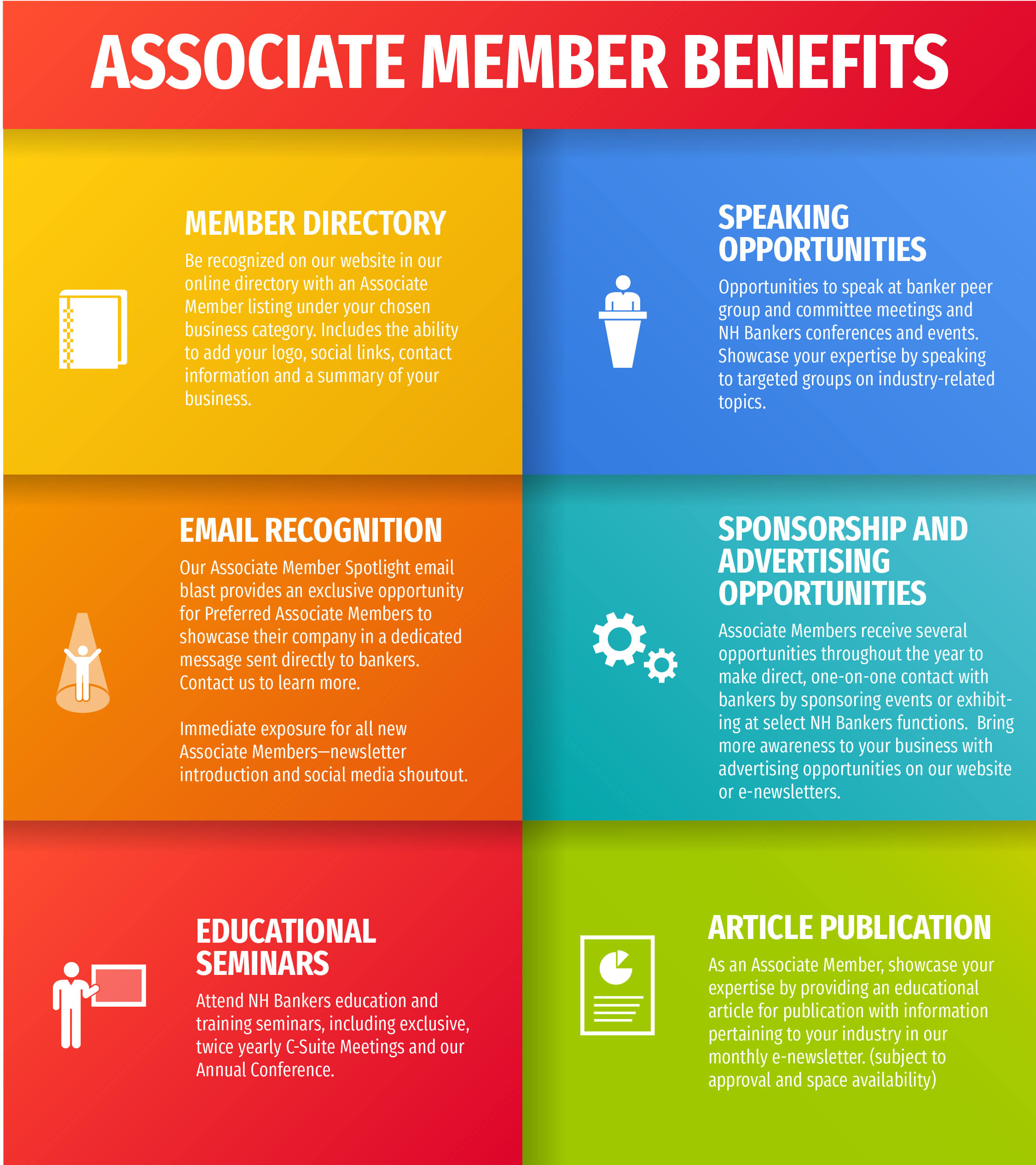 - Member rates and discounts on professional education designed specifically to meet the needs of New Hampshire bankers.